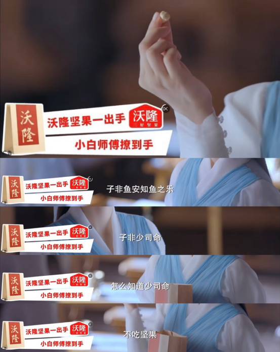 沃隆坚果在《玉骨遥》中的品牌露出再者是声画同步式沉浸,如口播标板,以口播搭配品牌形象的方式出现。剧集中,随着片中与片尾标板的亮相,“沃隆三好坚果,坚果中的大队长”的品牌形象立现,进一步带给观众感官上的多重刺激,释放品牌势能。在优质剧集内容的加持下,品牌理念于无形之中占领受众心智,实现品牌形象价值的传递。尤其像沃隆坚果这种短时间内的多剧连播,更易实现沟通场域与品牌势能的叠加,收获更强大的动能。
