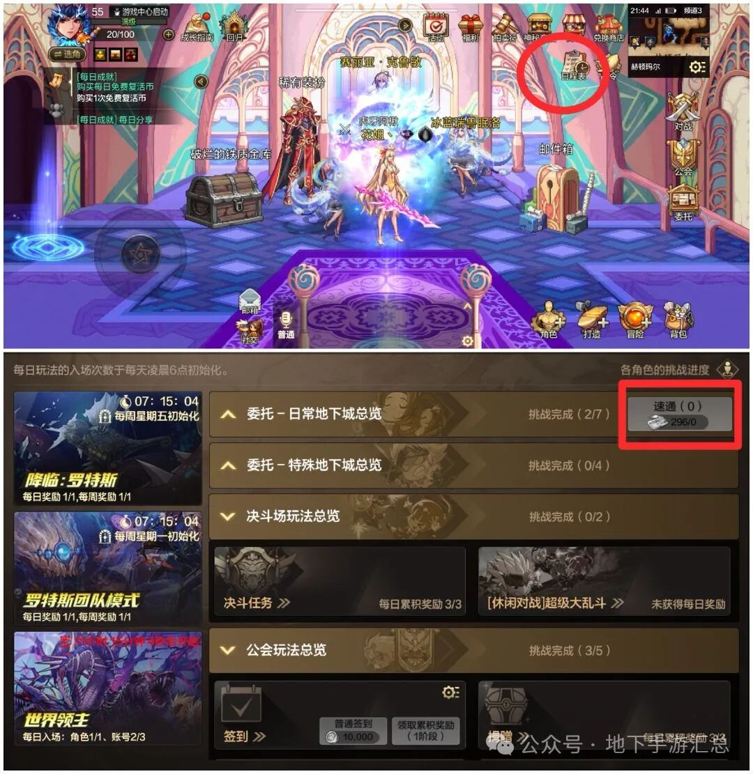 进入主界面以后,在屏幕右上有一个专属“日程表”也会详细记录各种玩法和角参与情况。选定日常副本即可“一键扫荡。