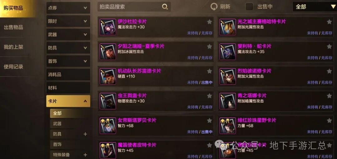 新版本优化了拍卖行的显示方式,直接显示物品信息和相关库存,特别是对卡片进行及分类,支持按部位搜索,同时搜索以后会在卡片下方,直接显示所有卡片属性和库存,更加直观。