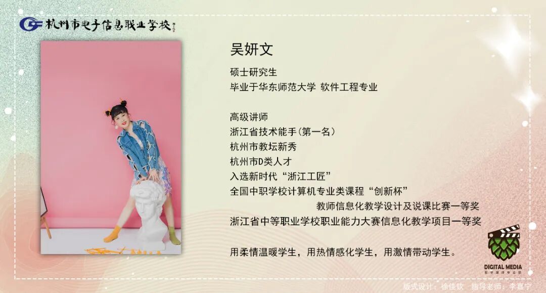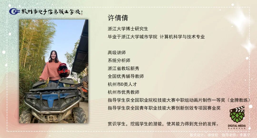 数字媒体技术应用专业是艺术与多媒体科技高度融合的多学科交叉的专业。主要学习图形图像设计、音视频制作、多媒体艺术设计、广告制作等课程。学校在高中三年中会安排该专业学生考取1+X数字创意建模职业技能等级证书。学生牛梦琦获“振兴杯”全国青年职业技能大赛专项奖,指导教师许倩倩,韩悦心,并获浙江省青年岗位能手称号(杭州市唯一一位获此殊荣的中职学生);吴妍文老师是浙江省教坛新秀,曾获浙江省中等职业学院职业能力大赛多媒体作品制作项目一等奖(第一名),并获浙江省技术能手称号。
