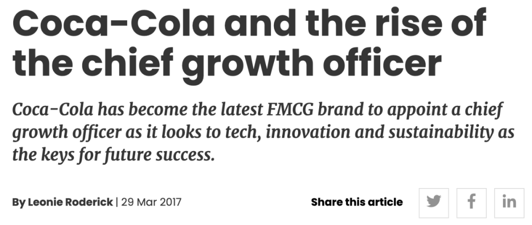 随着广告和企业生意的交集越来越大,它开始需要同时回应企业在传播和经营两个层面的需求。这个趋势有很多佐证,企业围绕这个方向的动作也变得越来越多。其中,颇具代表性的进展发生在2017年。当年3月,作为全球最大广告主之一的可口可乐宣布用CGO(首席增长官)取代CMO(首席营销官),一个字母之差将企业对业绩增长的迫切需求展露无疑。