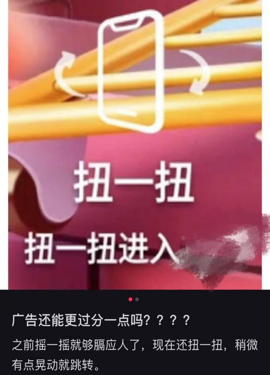 用户的忍让,换来的是跳转广告越发离谱:“摇一摇”进阶成“扭一扭”;“跳过”按钮藏在最边上、和背景一个颜色,找半天找不到;又或是把按钮设计得特别小,哪怕看到了也不敢轻易去点……