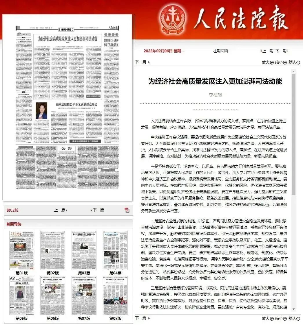 深化思想自觉2月6日,中院党组书记、院长李征明在《人民法院报》发表《为经济社会高质量发展注入更加澎湃司法动能》一文,彰显娄底法院全力优化法治化营商环境的决心与担当。