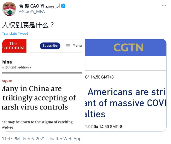 2月5日下午,中国驻黎巴嫩使馆领事部主任曹毅在其个人推特上用英文问道。
