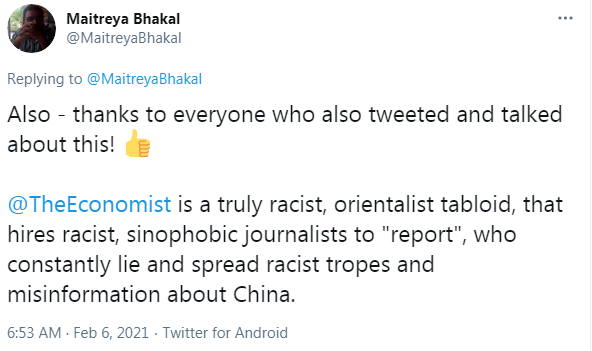 “《经济学人》是真正的种族主义、东方主义小报,雇用有种族主义和恐华情绪的记者来‘报道’,这些人不断撒谎并且散播种族主义言论和涉华错误信息。”巴卡尔说。