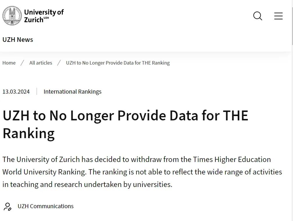 “评级方式存在缺陷”,是高校选择退出大学排名时提到最多的原因。(图/视觉中国)来源 | 青塔日前,苏黎世大学(University of Zurich,QS排名91)3月13日在官网发布消息称,苏黎世大学决定退出THE Ranking。因为该排名无法反映大学开展的各种广泛的教学和研究活动。以前,是所有高校牟足了劲要在大学排位赛里挣得一个好名次。现在,越来越多的高校退出大学排名,表示不再“参赛”。