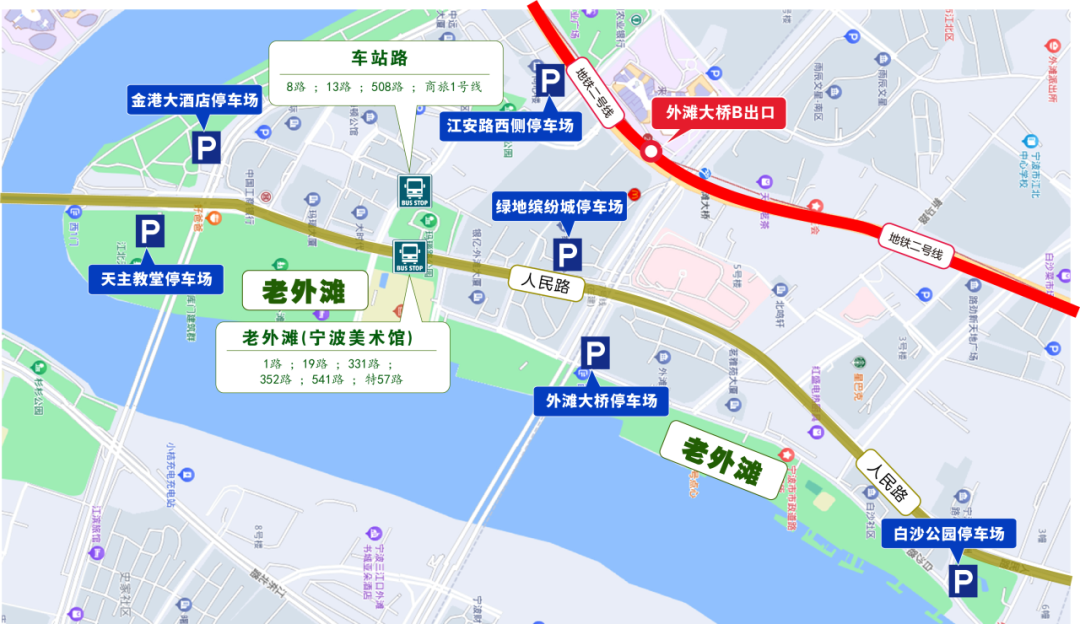 地铁出行可搭乘2号线至外滩大桥站下车(外滩景区内禁止社会车辆进入。)