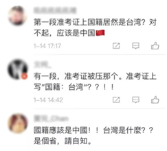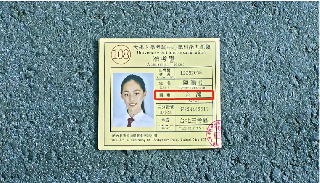在这段广告中,镜头停留在准考证上有2秒的时间,而准考证上有着“国籍”“台湾”的字样。